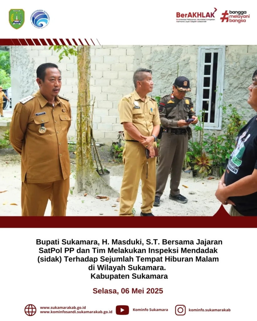 Sukamara, 06 Mei 2025 – Bupati Sukamara, H. Masduki, S.T. bersama jajaran Satpol-PP dan Tim melakukan inspeksi mendadak ( sidak ) terhadap sejumlah tempat hiburan malam di wilayah Sukamara. Kegiatan ini dilakukan sebagai respons atas laporan masyarakat yang menyampaikan kekhawatiran terkait maraknya peredaran minuman keras ilegal yang berpotensi meresahkan warga yang mengarah kekonflik dan mengganggu ketertiban umum.