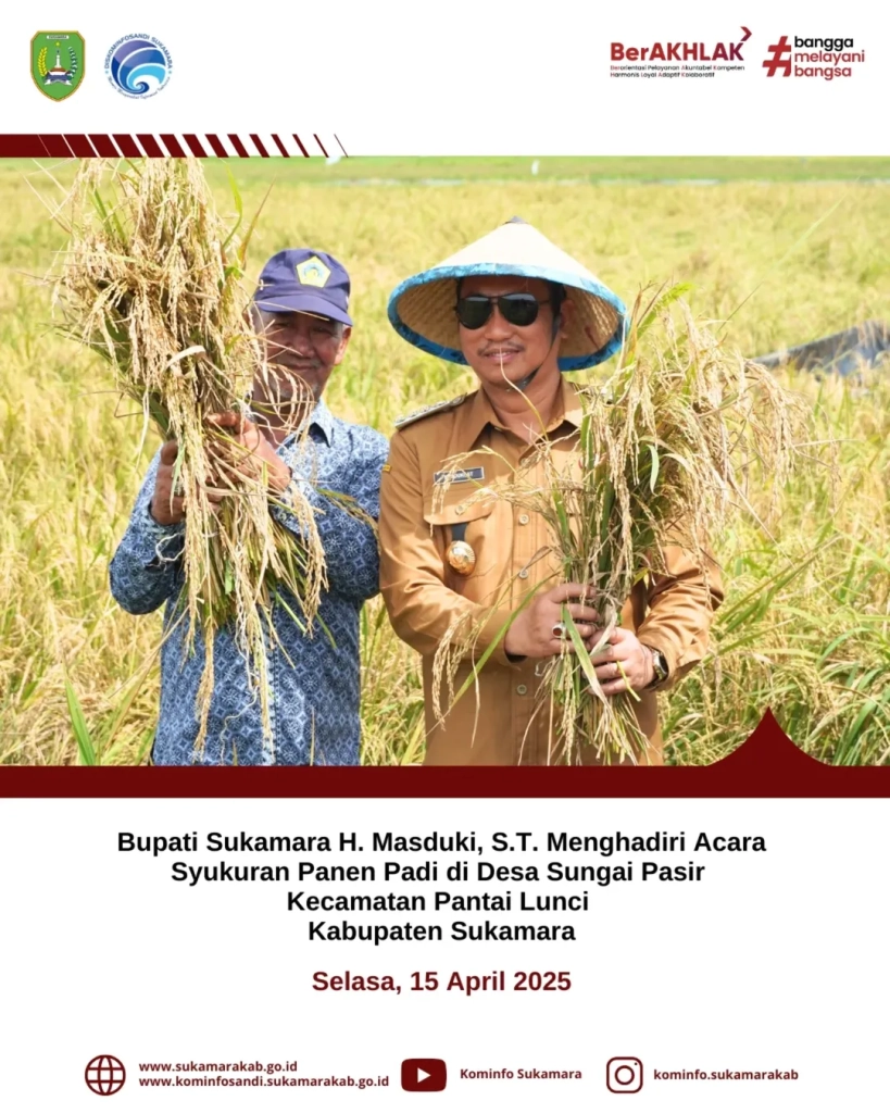 Bupati Sukamara H. Masduki, S.T. menghadiri acara syukuran panen padi di Desa Sungai Pasir Kecamatan Pantai Lunci dimana Suasana penuh syukur dan kebersamaan mewarnai Desa Sungai Pasir, di hadiri, Ketua DPRD Sukamara, Anggota DPRD Dapil III Sukamara, Staf Ahli Bupati Sukamara, Asisten Sekda Sukamara, Kepala OPD Sukamara, Kepala BPN Sukamara, Forkopimcam Pantai Lunci, Kepala Desa, Kepala BPD Pantai Lunci, Kepala KPHP Sukamara Lamandau, Gopoktan dan tamu undangan.