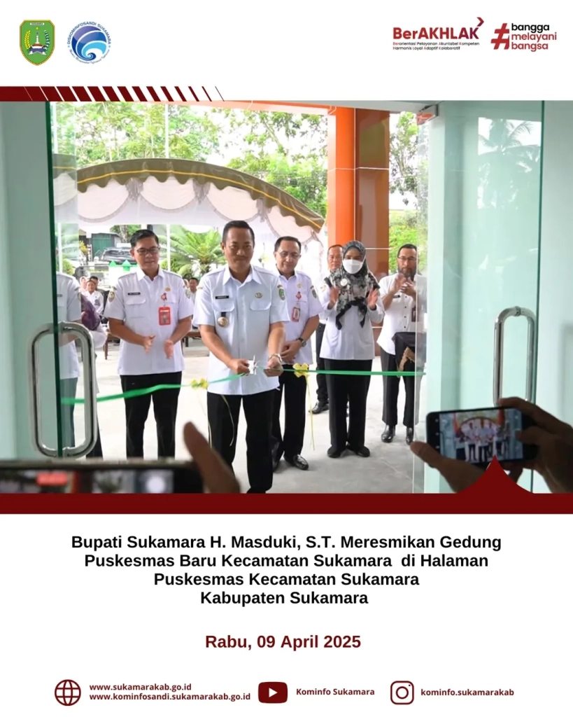 Dalam upaya meningkatkan akses dan kualitas pelayanan kesehatan bagi masyarakat, Bupati Sukamara H. Masduki, S.T. meresmikan gedung Puskesmas baru Kecamatan Sukamara. Acara peresmian yang berlangsung di halaman Puskesmas Kecamatan Sukamara tersebut didampingi oleh Staf Ahli Bupati Sukamara, Asisten Sekretaris Daerah Sukamara, Kepala Dinas Kesehatan Sukamara, tenaga medis.