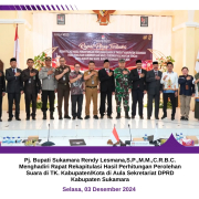 SUKAMARA – Rapat Rekapitulasi Hasil Perhitungan Perolehan Suara di TK. Kabupaten/Kota di hadiri Pj. Bupati Sukamara Rendy Lesmana,S.P.,M.M.,C.R.B.C. pada hari Selasa tanggal (03/12/2024) di Aula Sekretariat DPRD Sukamara.