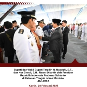 Bupati Sukamara, H. Masduki, dan Wakil Bupati Sukamara, Nur Efendi, resmi dilantik oleh Presiden Republik Indonesia, Prabowo Subianto, pada Kamis (20/02/2025) di Istana Negara, Jakarta. Pelantikan ini menandai awal kepemimpinan mereka untuk masa jabatan yang akan datang.