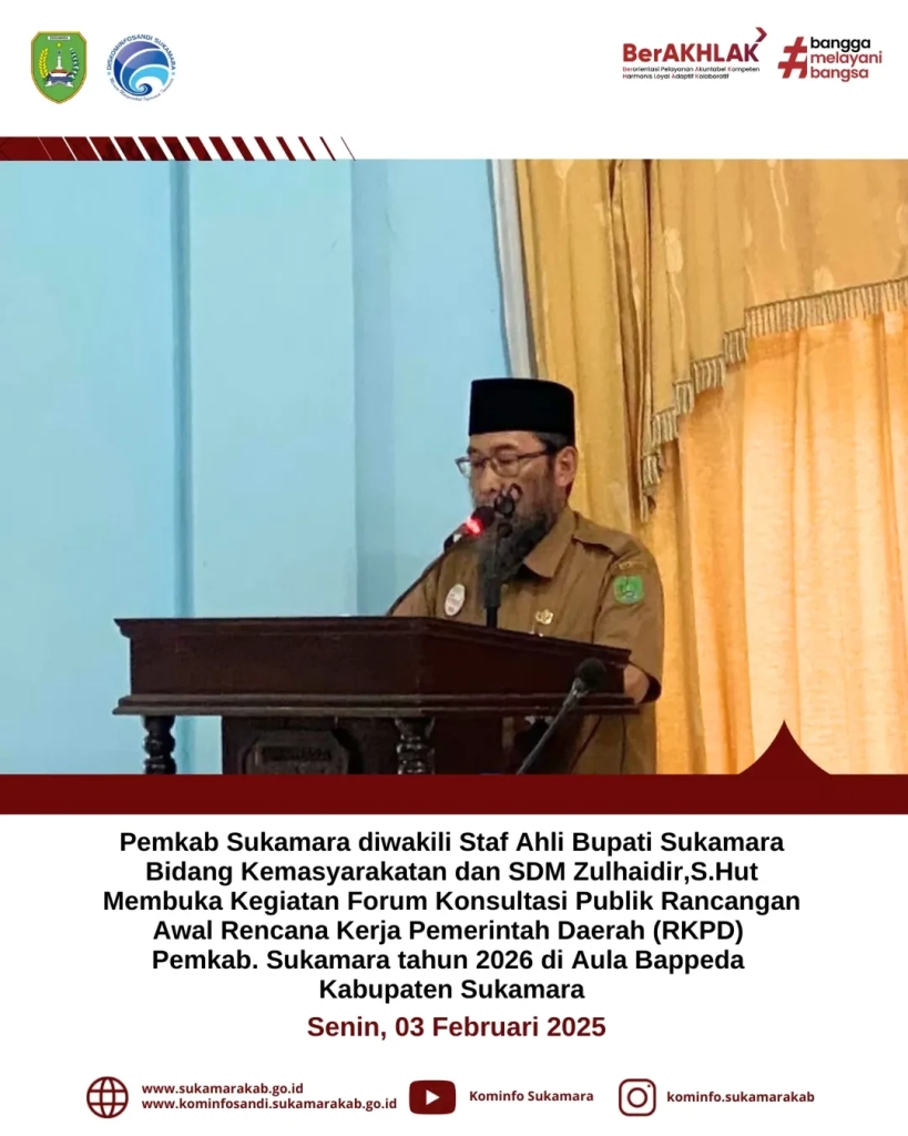 Pemkab. Sukamara diwakili Staf Ahli Bupati Sukamara Bidang Kemasyarakatan dan SDM Zulhaidir,S.Hut membuka kegiatan Forum Konsultasi Publik Rancangan Awal Rencana Kerja Pemerintah Daerah (RKPD) Pemkab. Sukamara tahun 2026 pada hari Senin (03/02/2025) di Aula Bappeda, dihadiri Forkopimda Sukamara, Wakil Ketua beserta Anggota DPRD Sukamara, Staf Ahli Bupati Sukamara, Asisten Sekda Sukamara, Kepala OPD Sukamara, Kepala Instansi Vertikal Sukamara, Camat, Pimpinan Perbankan, BUMN/BUMD Sukamara, Ketua Organisasi Wanita dan Tokoh Masyarakat serta tamu undangan.