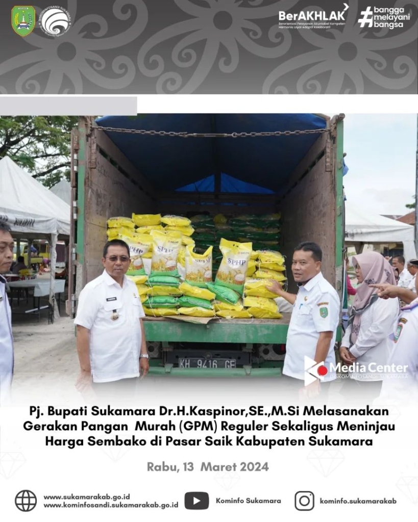 Pj. Bupati Sukamara Dr. H. Kaspinor, SE., M.Si didampingi Sekda Sukamara Rendy Lesmana S.P.,M.M., C.R.B.C serta Dinas Ketahanan Pangan dan Pertanian Kabupaten Sukamara melaksanakan kegiatan Gerakan Pangan Murah (GPM) sekaligus meninjau harga sembako pada hari Rabu (13/03/2024) di pasar Saik Sukamara.