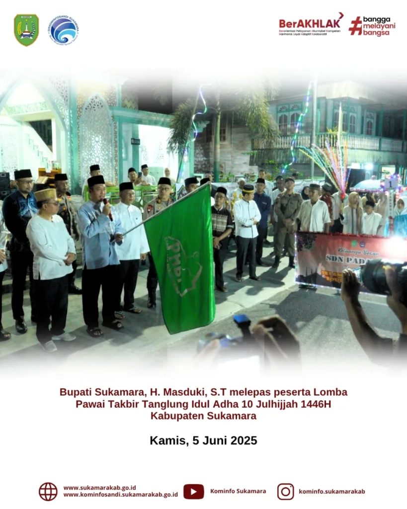 Sukamara, 06 Juni 2025 – Semarak perayaan Hari Raya Idul Adha 1446 H semakin terasa di Kabupaten Sukamara dengan digelarnya Lomba Pawai Tanglung, sebuah tradisi yang menghadirkan keindahan cahaya dan semangat kebersamaan. Acara ini dibuka secara resmi oleh Bupati Sukamara, H. Masduki, S.T., sekaligus melepas peserta lomba pawai takbir tanglung di depan Mesjid Al- Aqsha dan dihadiri Forkopimda Sukamara, Tokoh Agama dan Tokoh Masyarakat Sukamara, Staf Ahli Bupati Sukamara, Asisten Sekda Sukamara, Kepala OPD Sukamara, Kepala Kantor Kementerian Agama Sukamara, Ketua PHBI Sukamara, Peserta Pawai serta dan warga yang antusias menyaksikan pawai spektakuler ini.