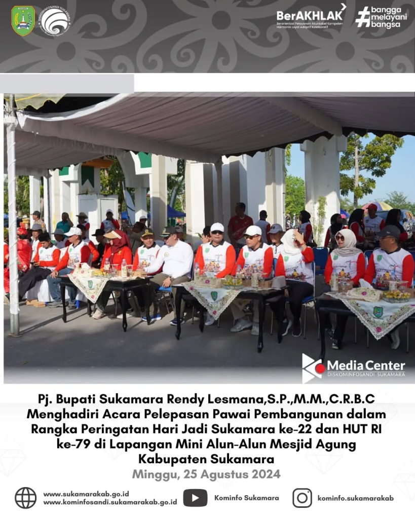 Pj. Bupati Sukamara Rendy Lesmana,S.P.,M.M.,C.R.B.C. hadir dalam rangka pelepasan pawai pembangunan, sebagai rangkaian kegiatan peringatan hari jadi ke-22 kabupaten sukamara dan hari ulang tahun ke-79 kemerdekaan republik indonesia tahun 2024 pada hari minggu tanggal (25/08/2024) di lapangan mini alun-alun Mesjid Agung yang dihadiri Forkopimda Sukamara, Wakil Ketua dan Anggota DPRD Sukamara, Plh. Sekda Sukamara, Staf Ahli Bupati Sukamara, Asisten Sekda Sukamara, Kepala OPD Sukamara, Kepala Instansi Vertikal Sukamara, Camat se-Kabupaten Sukamara, Lurah/Kades se-Kabupaten Sukamara, Ketua Tim Penggerak PKK, DWP, GOW, Bhayangkari, Persit Kartika Chandra Kirana dan Adhyaksa Dharmakarini Kabupaten Sukamara beserta para anggota; Peserta Pawai dan tamu undangan.