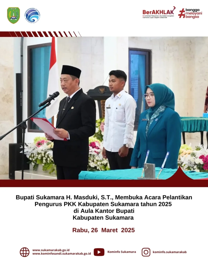 Bupati Sukamara H. Masduki, S.T., membuka acara Pelantikan Pengurus PKK Kabupaten Sukamara tahun 2025 pada hari rabu (26/03/2025) di Aula Kantor Bupati dihadiri, Wakil Bupati Sukamara Nur Efendi,S.H., Forkopimda Sukamara, Staf Ahli Bupati Sukamara, Asisten Sekda Sukamara, Kepala OPD Sukamara, Kepala Instansi Vertikal Sukamara, Camat, Ketua Organisasi Islam, Wanita, Sosial dan Pemuda Sukamara dan tamu undangan.