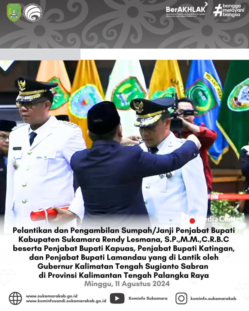 Gubernur Kalimantan Tengah Sugianto Sabran secara langsung melaksanakan pelatikan dan pengambilan sumpah/janji empat Penjabat Bupati termasuk Rendy Lesmana,S.P.,M.M.,C.R.B.C Kabupaten Sukamara. Pelantikan ini dilaksanakan pada hari Minggu tanggal 11/08/2024 di Provinsi Kalimantan Tengah Palangkaraya.