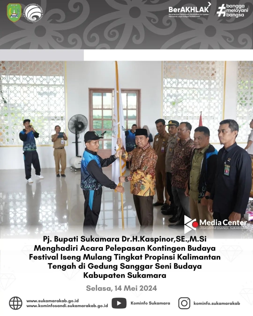 Pj. Bupati Sukamara Dr.H.Kaspinor,SE.,M.Si disela kesibukannya menghadiri acara pelepasan kontigen Festival Budaya Iseng Mulang Sukamara Tingkat Provinsi Kalimantan Tengah pada hari Selasa tanggal (14/05/2024) di Gedung sanggar seni budaya Sukamara yang dihadiri Forkopimda Sukamara, Staf Ahli Bupati Sukamara, Asisten Sekda Sukamara, Kepala OPD Sukamara, Kepala Kementerian Agama Sukamara, Pembina dan pendamping peserta festival iseng mulang dan tamu undangan.