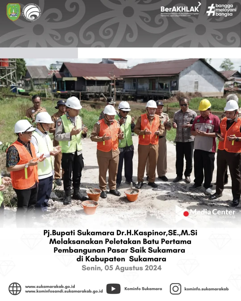 Pj. Bupati Sukamara Dr.H.Kaspinor,SE.,M.Si melaksanakan peletakan batu pertama pembangunan pasar saik pada hari Senin tanggal (05/08/2024) di tabuk pasar saik yang dihadiri Forkopimda Sukamara, Wakil Ketua DPRD beserta Anggota Sukamara, Sekretaris Daerah Sukamara Rendy Lesmana,S.P.,M.M.,C.R.B.C, Tokoh Agama, Tokoh Adat dan Tokoh Masyarakat Sukamara, Staf Ahli Bupati Sukamara, Asisten Sekda Sukamara, Kepala OPD Sukamara, Kepala Instansi Vertikel Sukamara, camat se kabupaten sukamara, ketua tim penggerak pkk, dwp, gow, bhayangkari, persit kartika chandra kirana dan adhyaksa dharma karini kabupaten sukamara beserta para anggota dan tamu undangan.