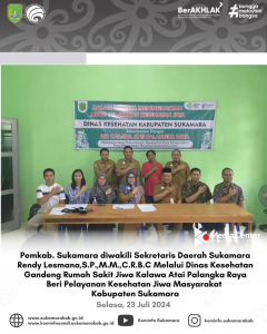 Pemkab Sukamara yang diwakili Sekda Sukamara Rendy Lesmana,S.P.,M.M.,C.R.B.C melalui Dinas Kesehatan melakukan kerjasama dengan Rumah Sakit Jiwa Kalawa Atei Palangka Raya pada hari Selasa (23/07/2024) di Puskesmas Sukamara. Ini merupakan sebagai upaya wujud meningkatkan mutu pelayanan kesehatan jiwa masyarakat Sukamara, dimana dokter spesialis psikiater dan psikolog kejiwaan RSJ Kelawa Atei berkunjung melakukan pemeriksaan dan pegobatan pasien di Puskesmas Sukamara.
