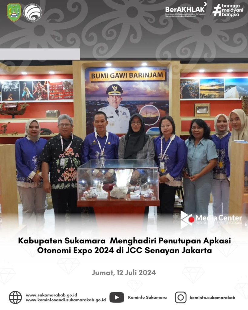 Kabupaten Sukamara turut menghadiri penutupan Apkasi Otonomi Expo 2024di JCC Senayan yang diwakili oleh Kepala Dinas Koperasi Usaha Kecil Menengah dan Perdagangan dan Kepala Dinas Perikanan Kabupaten Sukamara yang ditutup langsung oleh Menteri Pemuda dan Olahraga, Bapak Dito Ariotedjo pada hari Jumat, 12 Juli 2024. Turut hadir ketua Tim PKK Kabupaten Sukamara, Kepala Perangkat Daerah dan staf terkait dalam kegiatan ini.