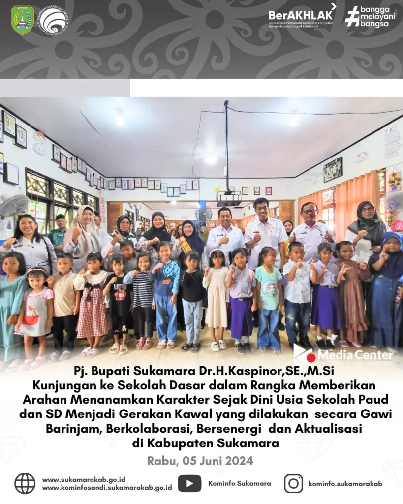 Pj. Bupati Sukamara Dr.H.Kaspinor,SE.,M.Si berkunjung ke Sekolah Dasar Negeri Sukamara dalam rangka memantau dan melihat tumbuh kembang siswa-siswi sekolah dan menanamkan karakter sejak dini usia sekolah Paud dan SD pada hari rabu tanggal (05/06/2024) bertepatan dengan penerimaan siswa siswi baru di SDN Mendawai 2 dan SDN Mendawai 3 didampingi Kepala Dinas Pendidikan dan Kebudayaan, Bunda Paud Kab. Sukamara, Pengawas dan Penilik TK/SD.