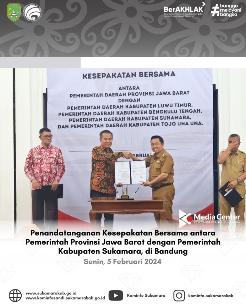 Pj. Bupati Sukamara Dr.H.Kaspinor,SE.,M.Si menghadiri acara Penandatangan Kesepakatan Bersama (MoU) Provinsi Jawa Barat dengan Pemerintah Kabupaten Sukamara di Kota Bandung pada hari Senin tanggal 5 Februari 2024. Kegiatan penandatangan ini dilaksanakan oleh Pj Gubernur Jawa Barat Dr. Bey Machmudin dengan Pj. Bupati Sukamara terkait dengan Program Pengembangan Potensi Daerah dan Pelayanan Publik Data Berbasis Elektronik di Gedung Sate yang didampingi oleh Kepala OPD Sukamara terkait dan Tim teknis Sukamara.