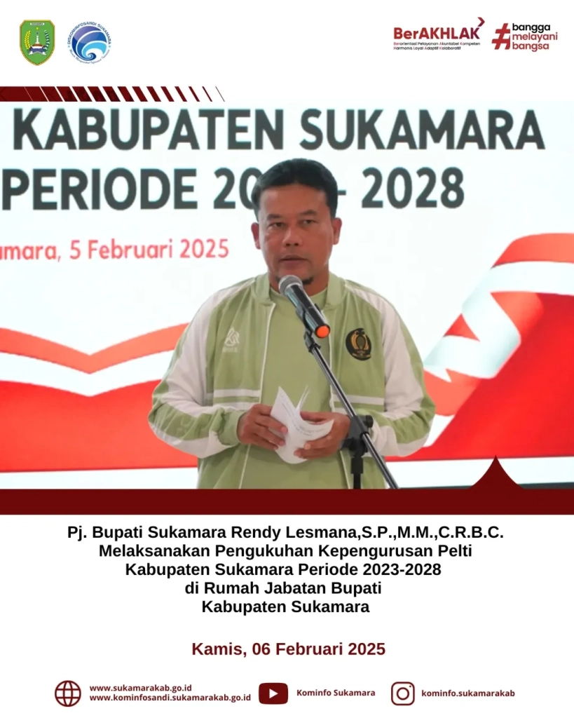 Pj. Bupati Sukamara Rendy Lesmana,S.P.,M.M.,C.R.B.C. melaksanakan pengukuhan kepengurusan Pelti Kabupaten Sukamara Periode 2023-2028 pada hari Kamis (06/02/2025) di Rumah Jabatan Bupati, dihadiri Forkopimda Sukamara, Staf Ahli Bupati Sukamara, Asisten Sekda Sukamara, Kepala OPD Sukamara, Ketua Pelti Provinsi Kalteng, Ketua Koni Sukamara, Ketua Pelti Sukamara, dan tamu undangan.