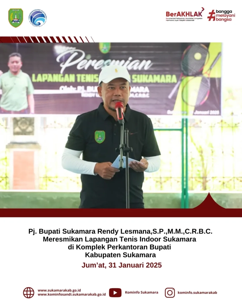 Pj. Bupati Sukamara Rendy Lesmana,S.P.,M.M.,C.R.B.C. meresmikan lapangan tenis indoor sukamara pada hari Jum’at (31/01/2025) di Komplek Perkantoran Bupati Sukamara. Dihadiri Forkopimda Sukamara, Kepala OPD Sukamara, Club Tenis Sukamara dan tamu undangan. Pj. Bupati Sukamara dalam wawancaranya menjelaskan bahwa Peresmian lapangan tenis Indoor Sukamara sebagai fasilitas yang di sediakan oleh Pemkab Sukamara dalam rangka untuk peningkatan prestasi tenis lapangan di Kab. Sukamara. Notabenenya saat ini prestasi Kab Sukamara cukup baik diajang Tingkat Provinsi, Untuk itu tujuannya lebih meningkatkan prestasi maka pemerintah daerah menyediakan lapangan tenis indoor ini kolaborasi dengan DPRD.