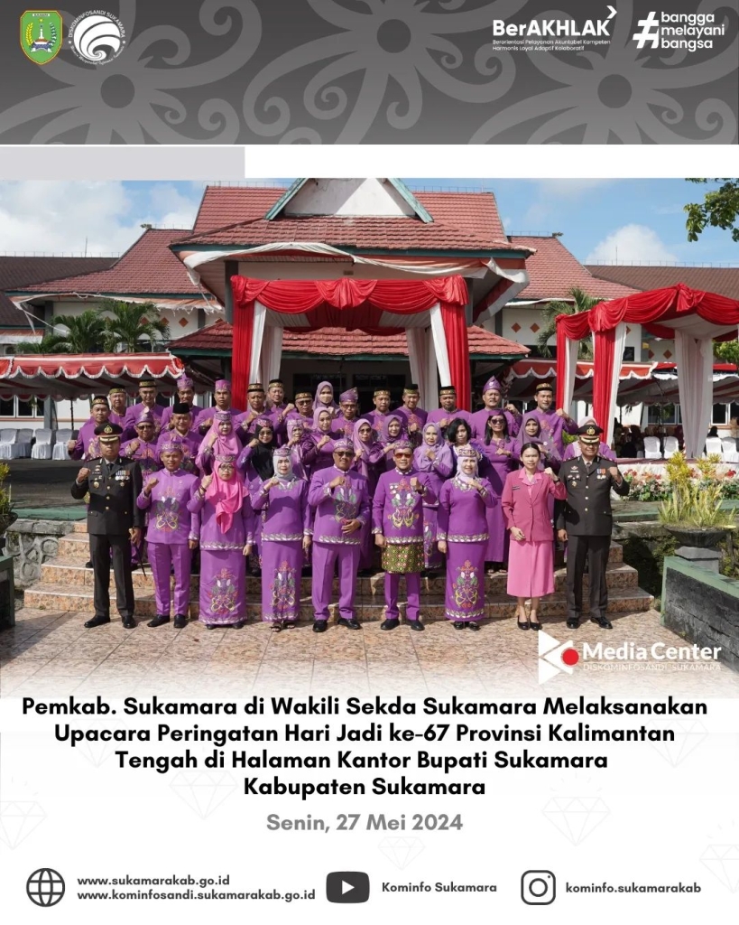 Pemkab Sukamara yang diwakili Sekretaris Daerah Sukamara melaksanakan upacara hari jadi ke 67 Provinsi Kalimatan Tengah dengan mengusung tema Kalteng berkah, maju dan bermartabat pada hari senin tanggal 27/05/2024 di halaman Kantor Bupati Sukamara yang dihadiri Forkopimda Sukamara, Staf Ahli Bupati Sukamara, ASN dan tenaga kontrak serta tamu undangan.