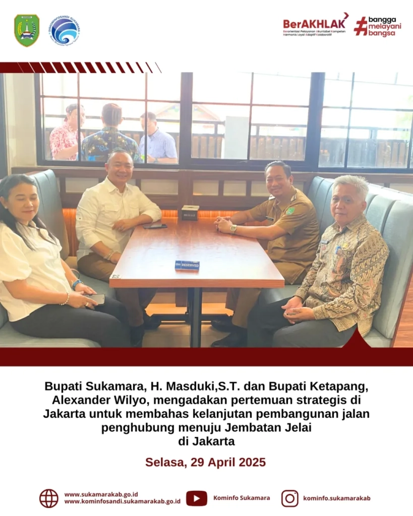 Jakarta, 29 April 2025 – Dalam upaya memperkuat konektivitas wilayah dan meningkatkan kerja sama antar kabupaten, Bupati Sukamara, H. Masduki,S.T. dan Bupati Ketapang, Alexander Wilyo, mengadakan pertemuan strategis di Jakarta untuk membahas kelanjutan pembangunan jalan penghubung menuju Jembatan Jelai. Pertemuan ini didampingi para pejabat masing-masing Kabupaten/Kota.