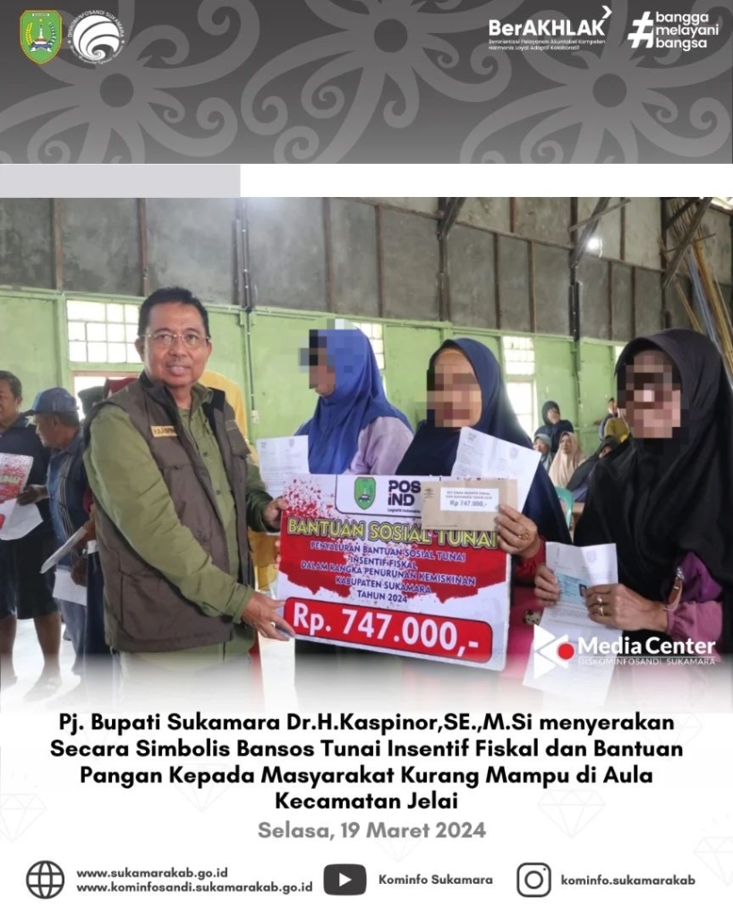Pj. Bupati Sukamara Dr.H.Kaspinor, SE.,M.Si secara simbolis menyerahkan penyaluran bantuan sosial insentif fiskal dan bantuan pangan dalam rangka penurunan kemiskinan di Kecamatan Kuala Jelai pada hari Selasa (19/03/2024) di Aula Kecamatan Jelai dihadiri Kepala Dinas SOSPMD Sukamara sebagai penyelenggara kegiatan bantuan, Kepala OPD terkait Sukamara, Camat Jelai dan tamu undangan.