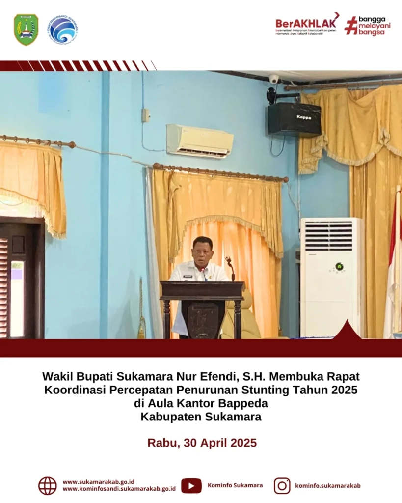 Sukamara, 30 April 2024 – Wakil Bupati Sukamara Nur Efendi, S.H. membuka rapat koordinasi percepatan penurunan stunting tahun 2025 di Aula Kantor Bappeda, dihadiri Sekretaris Daerah Sukamara, Tim PPPS Sukamara, Staf Ahli Bupati Sukamara, Asisten Sekda Sukamara, Kepala OPD Sukamara, Kepala Instansi Vertikal Sukamara, Camat, Ketua Tim Penggerak PKK Sukamara, Kepala Puskesmas, PKB, PLKB se Kabupaten Sukamara, Lurah/Kepala Desa dan tamu undangan.