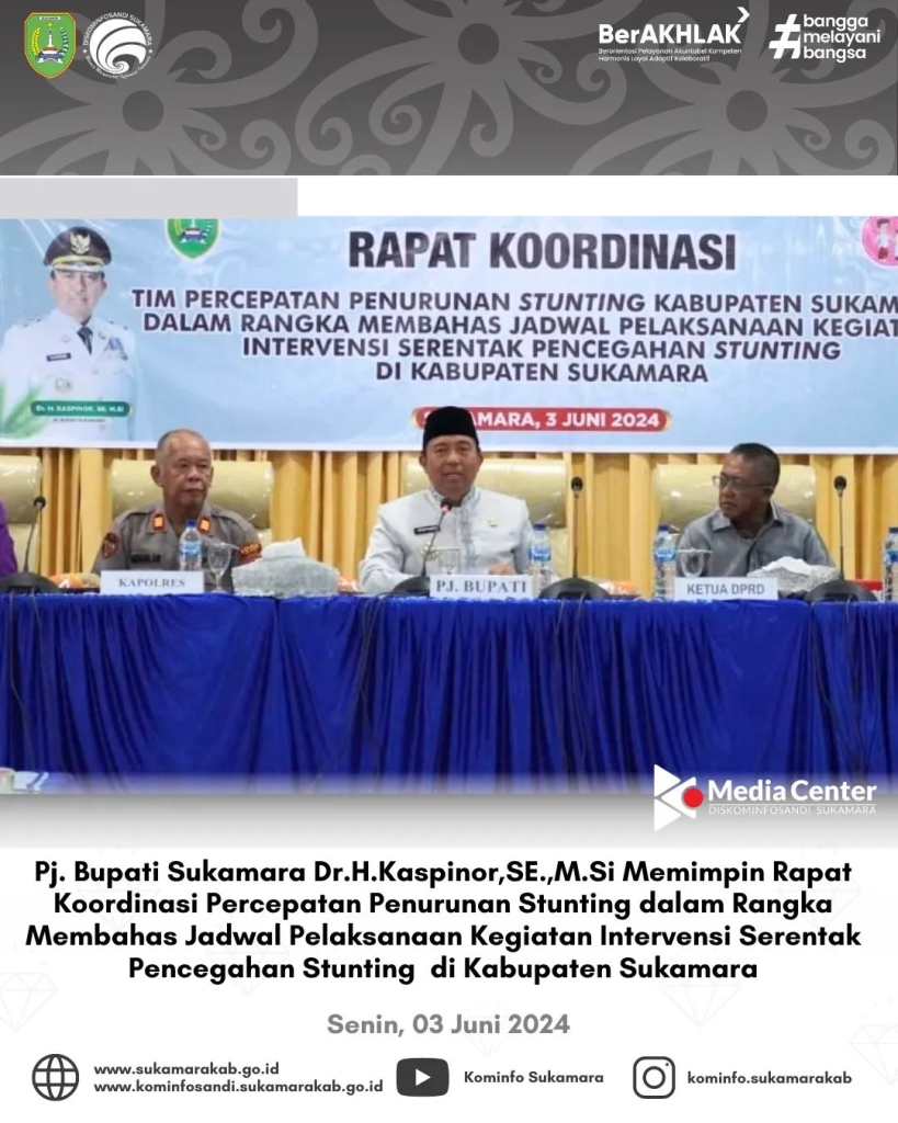 Pj. Bupati Sukamara Dr.H.Kaspinor,SE.,M.Si memimpin rapat koordinasi tim percepatan penurunan stunting (TPPS) pada kegiatan intervensi serentak penanganan stunting pada hari senin tanggal (03/06/2024) di Aula Bappeda Sukamara di hadiri jajaran Forkopimda Sukamara, Staf Ahli Bupati Sukamara, Asisten Sekda Sukamara, Kepala OPD Sukamara, Kepala Instansi Vertikal Sukamara, Camat se Kabupaten Sukamara, Lurah se Kabupaten Sukamara, Kepala UPT Puskesmas se Kabupaten Sukamara, dan tamu undangan.
