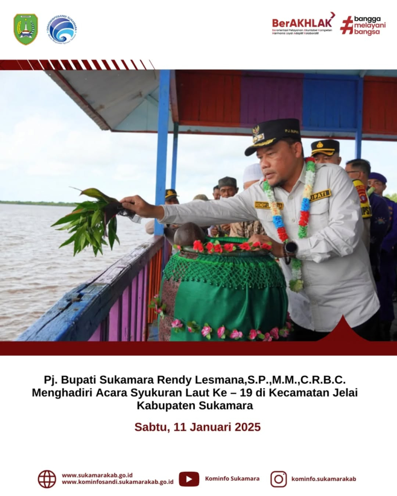 Acara syukuran laut ke – 19 di hadiri Pj. Bupati Sukamara Rendy Lesmana, S.P.,M.M.,C.R.B.C. pada hari Sabu tanggal (11/01/2025) di Kecamatan Jelai, hadir Forkopimda Sukamara, Pj. Sekretaris Daerah Sukamara Yofi Yudistira,S.Pt, Staf Ahli Bupati Sukamara, Asisten Sekda Sukamara, Kepala OPD Sukamara, Kepala Instansi Vertikal Sukamara, Camat, Lurah/Kades beserta Ketua BPD Kecamatan Jelai, Pimpinan Perbankan, Direktur BUMN/BUMD dan Organisasi Wanita Sukamara, Pemuka Agama, Tokoh Adat dan Tokoh Masyarakat Kecamatan Jelai dan tamu undangan.