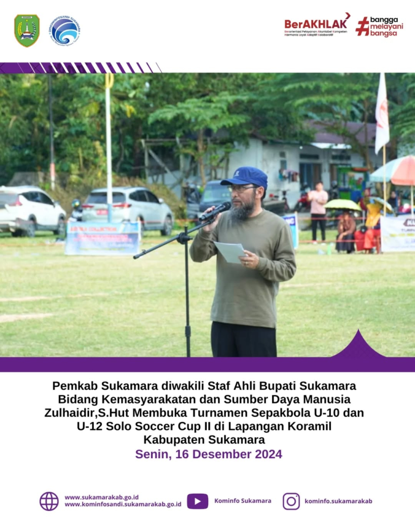 Staf Ahli Bupati Sukamara Bidang Kemasyarakatan dan Sumber Daya Manusia Zulhaidir,S.Hut membuka turnamen sepak bola U-10 dan U-12 Solo Soccer Cup II pada hari senin, tanggal (16/12/2024) di lapangan Koramil Sukamara yang dihadiri Forkopimda Sukamara, Staf Ahli Bupati Sukamara, Asisten Sekda Sukamara, Kepala OPD Sukamara, Ketua KONI dan PSSI Sukamara, para Offisial dan tamu undangan.