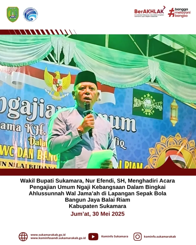 Wakil Bupati Sukamara Nur Efendi, S.H., menghadiri acara pengajian umum ngaji kebangsaan dalam bingkai Ahlussunnah Wal Jama’ah Bersama Gus Muwafik Sleman Yogyakarta di Lapangan Sepak Bola Desa Bangun Jaya, Balai Riam, Kegiatan ini dihadiri oleh Forkopimda Sukamara, Staf Ahli Bupati Sukamara, Asisten Sekda Sukamara, Kepala OPD Sukamara, Kepala Instansi Vertikal Sukamara, Forkopimcan Kecamatan Balai Riam dan Kecamatan Permata Kecubung, Kades dan BPD Balai Riam dan para Kaum Muslimin dan Muslimat yang turut memberikan dukungan terhadap penguatan nilai-nilai kebangsaan dan keislaman dalam kehidupan bermasyarakat.