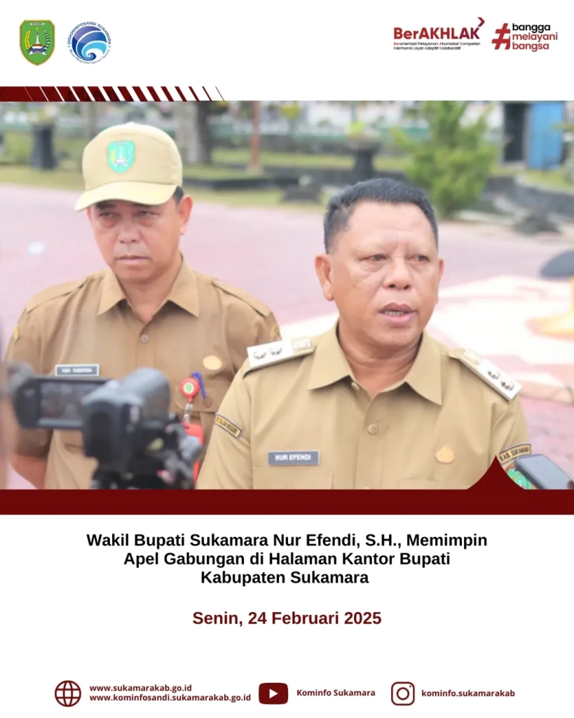 Wakil Bupati Sukamara Nur Efendi,S.H., memimpin apel gabungan pada hari senin (24/02/2025) di halaman kantor Bupati Sukamara, dihadiri seluruh Pejabat Eselon II, Pejabat Admistrator Eselon III, Pejabat Pengawas dan Fungsional eselon IV, dan seluruh ASN serta tenaga Kontrak di Lingkungan Pemerintahan Kabupaten Sukamara.Dalam wawancara dengan awak media Wakil Bupati menyampaikan dalam apel perdana tentang arahan-arahan umum yang disampaikan, terutama perlu adanya keselarasan program kerja antara pemerintah daerah dengan pemerintah pusat, sebagai program nawacita dari Presiden RI yang wajib dilakanakan. Untuk program arahan kedepannya itu yang perlu kerjasama dan kolaburasi serta ditindaklanjuti dalam melaksanakan tugas-tugas tersebut yang akan dilaksanakan dan diselaraskan dengan program pemerintah Pusat dan daerah.”imbuhnya”